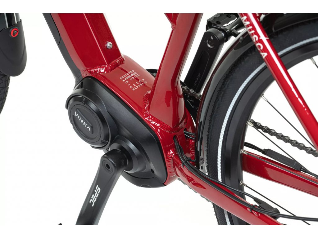 Nadstandardní výbava jako jsou hydraulické kotoučové brzdy a řazení Shimano, uzamykatelná odpružená vidlice Suntour, LED osvětlení a další potěší svou trvanlivostí a spolehlivostí. O pohodlnou jízdu bez námahy se stará osvědčený japonský středový elektromotor Vinka E20 s kroutícím momentem 80Nm a plně integrovaná baterie, která díky své kapacitě 17,5 Ah na jedno nabití umožňuje dojezd přibližně 80 - 130 km. 4 ampérová nabíječka zajistí dostatečně rychlé nabití takto výkonné baterie.