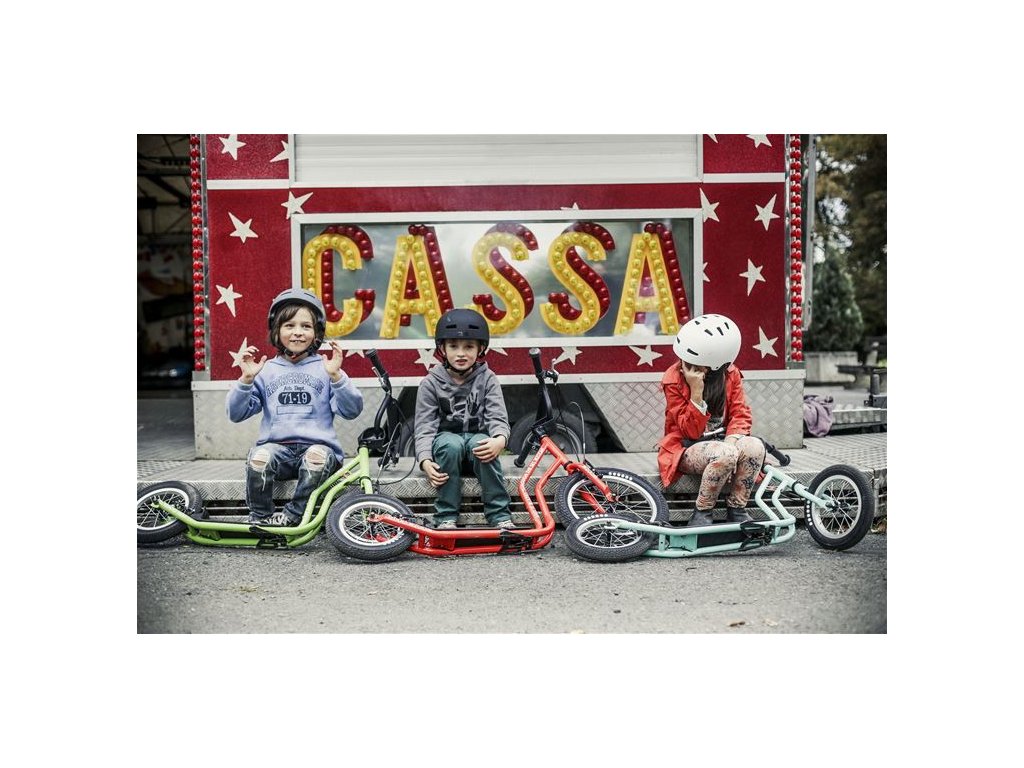 Koloběžka pro ty, co už v šatně plánují, jak po cestě ze školy pojedou chytat žáby ke splavu nebo konečně otevřou vrátka té staré zahrady. Tidit má nově brzdy na obou kolech, takže bezpečně zvládne ostřejší styl jízdy, ztížené jízdní podmínky i drsnější zacházení. I když to nedoporučujeme, víme, jak neodolatelné je sjet z obrubníku nebo zvládnout překážku ve skate parku. Radši jsme na to stroj připravili.