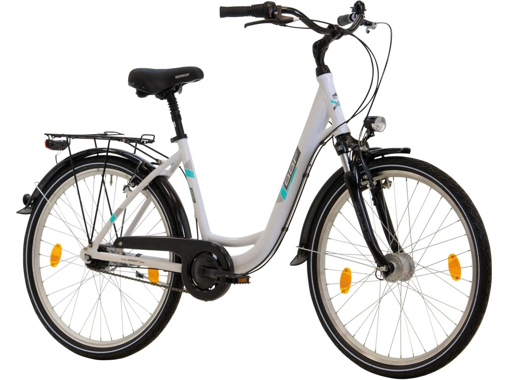 Dámské kolo do města od německé firmy BBF je praktické, funkční a zároveň i elegantní. Hluboko prohnutý hliníkový rám s nízkým nástupem, odpružená vidlice a sedlová trubka, kvalitní osvětlení diodovými světly a sedm rychlostí v nábojové převodovce Shimano.