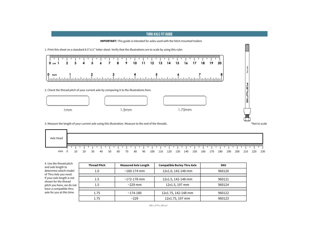 Vybavte své kolo pro nové dobrodružství s adaptérem Burley Thru Axle. Tento snadno adaptér vám otevře nové možnosti a umožňuje připojit dětský, nákladní nebo přepravní vozík ke kolům s 12mm pevnou osou. Pro výběr správného typu použijte průvodce kompatibilitou Burley Thru Axle. Pokud si nejste jisti správným závitem nebo délkou náboje, doporučujeme kontaktovat výrobce vašeho kola nebo se poradit v místním cykloservisu ještě před zakoupením adaptéru Burley Thru Axle.