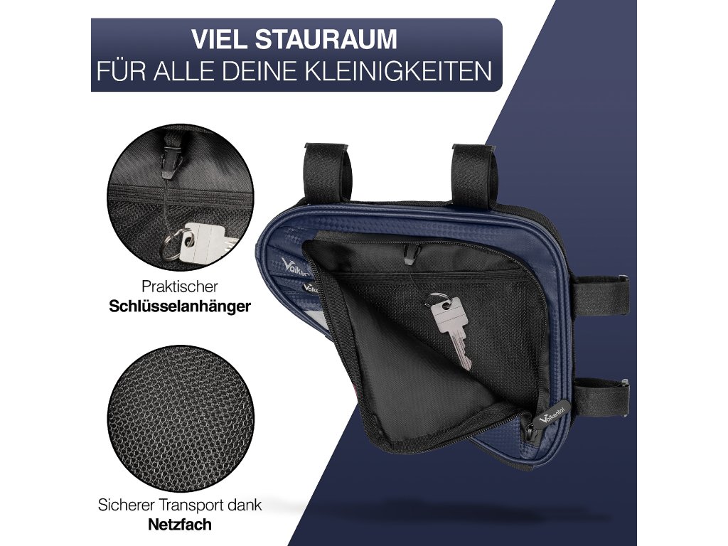 Rámová brašna Valkental Triangle Bag v modrém provedení je ideálním doplňkem pro cyklisty, kteří hledají praktické řešení pro uložení svých věcí a zároveň chtějí svému kolu dodat moderní a svěží vzhled. Díky svému trojúhelníkovému tvaru perfektně zapadne do rámu kola a neomezuje pohodlí ani stabilitu během jízdy. Brašna poskytuje dostatek úložného prostoru pro všechny nezbytnosti, jako je mobilní telefon, peněženka, klíče, cyklistické nářadí, náhradní duše nebo menší svačina. Je vhodná jak pro každodenní dojíždění, tak pro delší vyjížďky a sportovní jízdu.