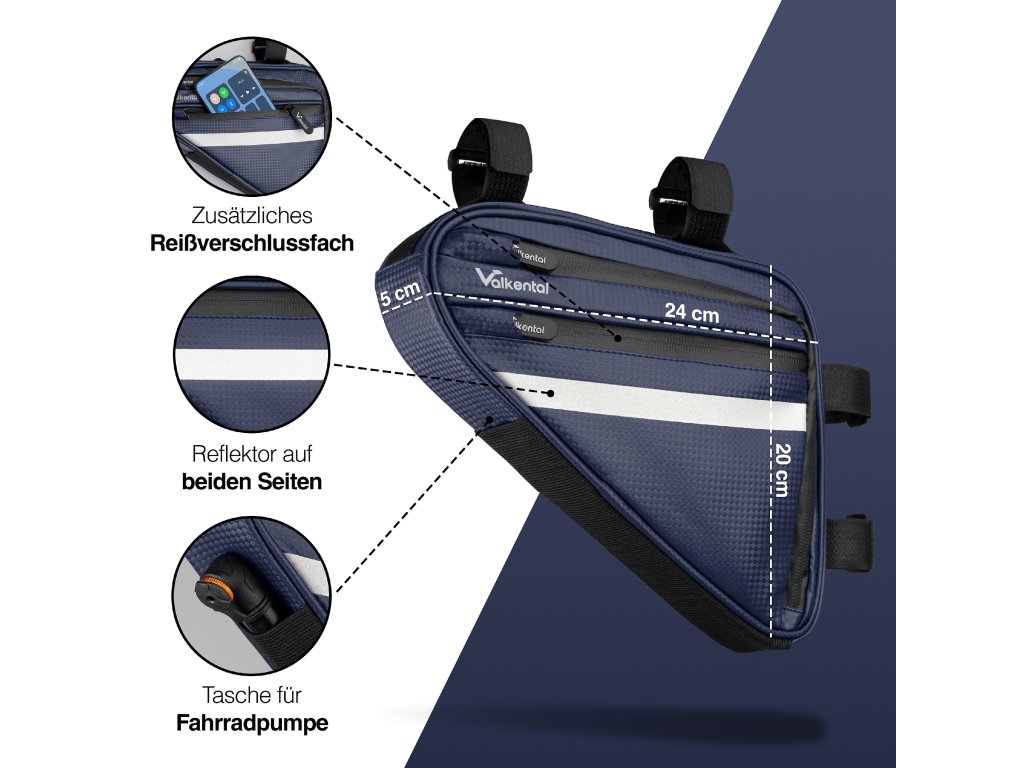 Modrá barva dodává kolu elegantní a sportovní vzhled a snadno se kombinuje s většinou rámů kol. Brašna se rychle a jednoduše upevňuje do rámu kola, drží pevně na svém místě a je navržena tak, aby zvládla běžné zatížení i náročnější podmínky při jízdě. Valkental Triangle Bag představuje spojení funkčnosti, kvalitního zpracování a atraktivního designu, které ocení každý cyklista.