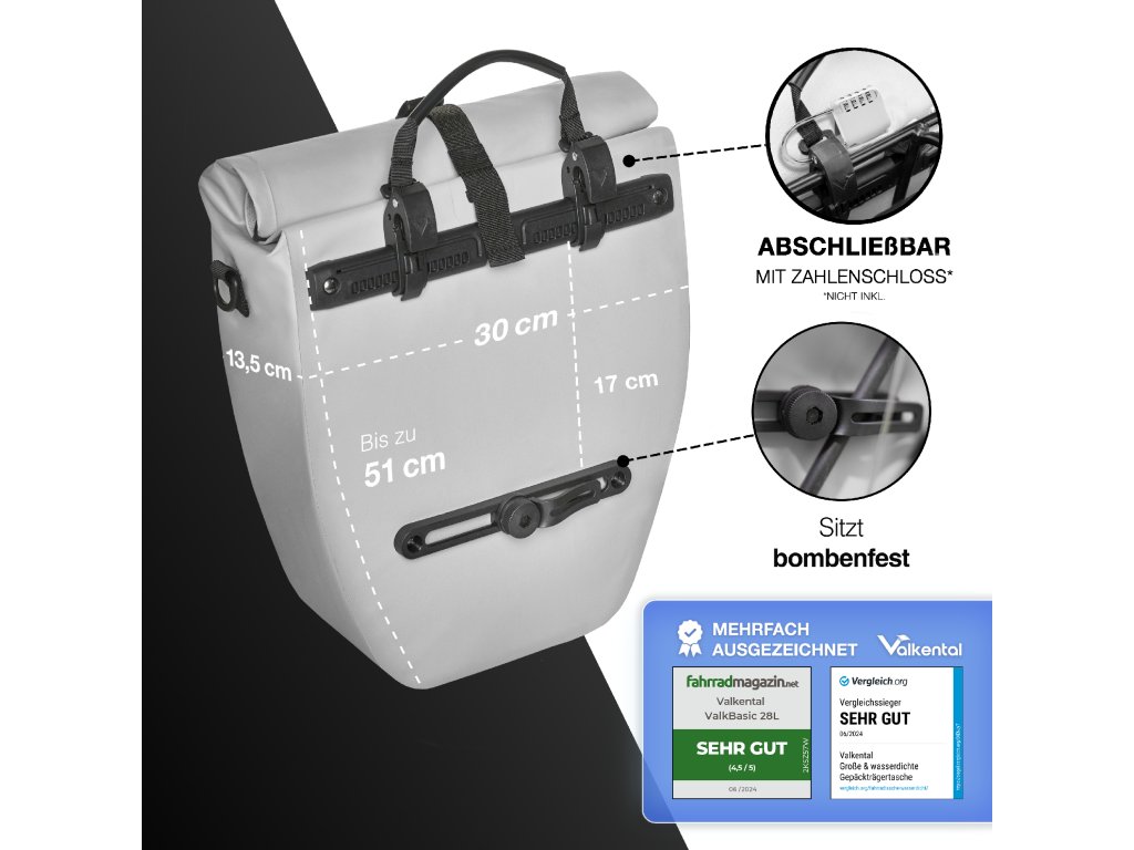 Reflexní brašna ValkBasic od značky Valkental je praktickým a spolehlivým doplňkem pro každodenní dojíždění i delší cyklistické výlety. Díky voděodolnému materiálu z odolné plachtoviny účinně chrání uložené věci před deštěm, vlhkostí i nečistotami, takže se na ni můžete spolehnout za každého počasí. Rolovací uzávěr umožňuje flexibilně přizpůsobit objem podle aktuální potřeby v rozmezí 18 až 22 litrů a zároveň zajišťuje bezpečné uzavření obsahu. Rozměry brašny v rozrolovaném stavu jsou 51 × 30 × 13,5 cm a její hmotnost je pouhých 700 gramů, což z ní činí lehké, ale zároveň dostatečně prostorné řešení. Upevnění na nosič je řešeno pomocí pevných háků s maximálním průměrem 16 mm. Vzdálenost háků od dna brašny je 34 cm, což umožňuje dobrou kompatibilitu s různými typy zadních nosičů. Součástí balení jsou také redukční vložky pro různé průměry trubek, které zajišťují stabilní a bezpečné uchycení. Praktický ramenní popruh navíc umožňuje pohodlné nošení brašny i mimo kolo.