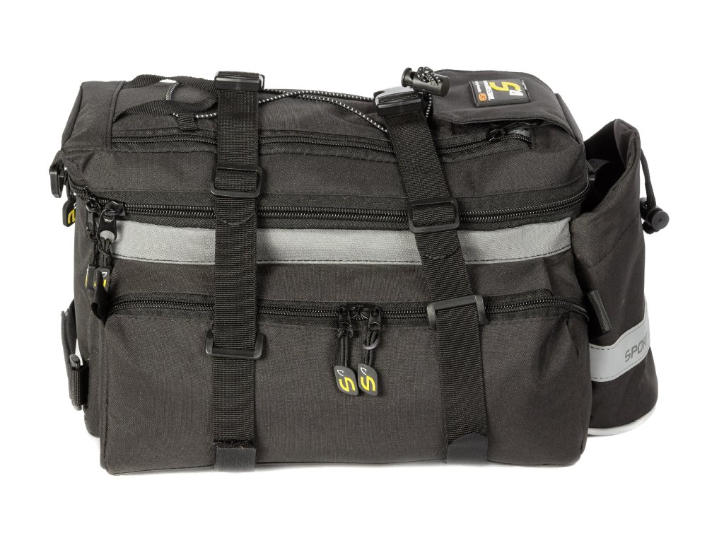 Brašna je vybavena jednou velkou vnitřní kapsou a dvěma postranními vnějšími kapsami uzavíratelnými zipem, což umožňuje přehledné a praktické rozložení nákladu. Kompresní popruhy zajišťují pevné fixování obsahu, zatímco pevné dno brašny s originálním QuickFix systémem poskytuje stabilní upnutí k nosiči. Pro další pohodlí a praktické využití je brašna vybavena gumicukem pro připevnění dodatečného nákladu, kapsou na cyklistickou láhev, reflexními prvky pro zvýšení bezpečnosti, popruhem pro přenášení brašny na rameni a návlekem proti znečištění.