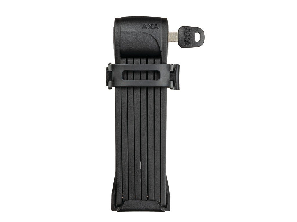 Zámek AXA Fold Lite je dodáván s praktickým držákem. Ten lze namontovat do otvorů pro košík na láhev nebo jej pomocí dvou přiložených montážních pásků připevnit na rám. Protože není nutné zámek z držáku vysouvat, je vhodný pro všechny typy rámů. Díky revolučnímu uzamykacímu mechanismu zámek pevně drží v držáku a během jízdy neklepe. Díky flexibilním kloubům se zámek velmi snadno ovládá. Je vyroben z oceli a opatřen měkkým ochranným obalem, který chrání rám kola před poškrábáním. AXA Fold je vybaven symetrickým klíčem, který je velmi praktický při zamykání i odemykání, zejména za tmy.