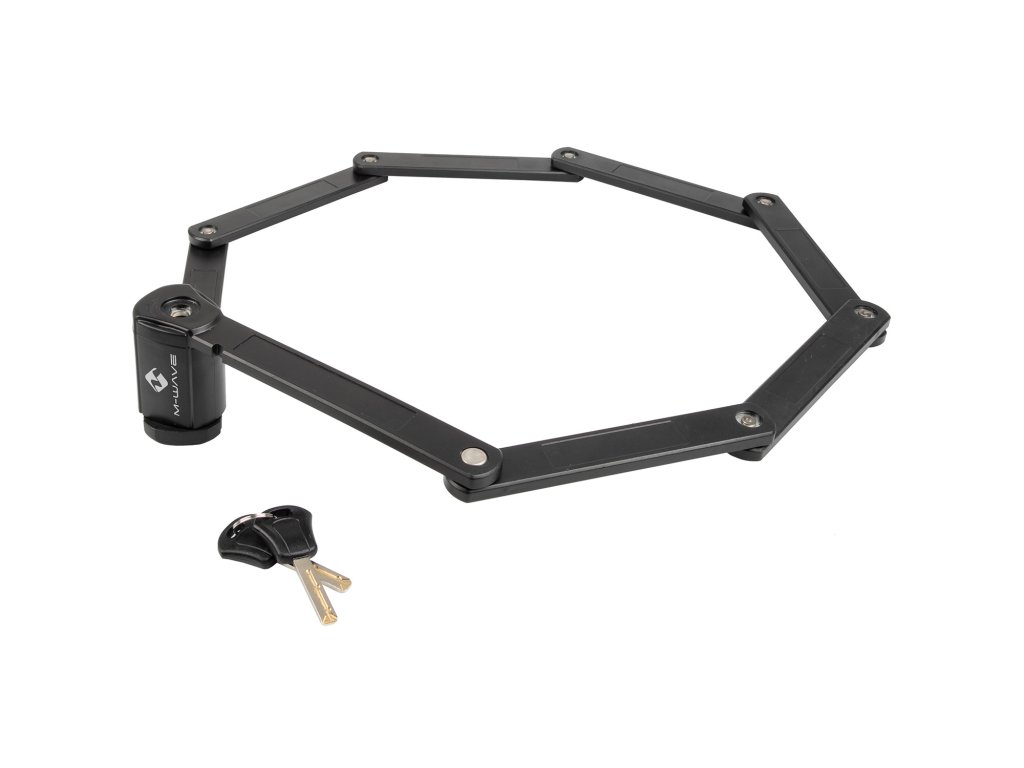 Kompaktní skládací zámek s osmi ocelovými články nabízí vysokou úroveň zabezpečení a zároveň minimální nároky na prostor. Tělo zámku je tvořeno tvrzenými ocelovými články s plastovým krytím, které chrání rám kola před poškrábáním. Nerezové šrouby zajišťují dlouhou životnost a odolnost vůči povětrnostním vlivům.