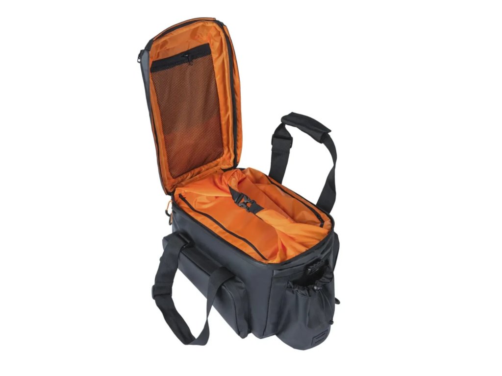 Hledáte tašku, kde bylo myšleno na všechno? Pak je kufr Basil Miles XL Pro vaší volbou. Tato sportovní taška je voděodolná a má mnoho praktických funkcí. Má dvě voděodolné, skládací boční kapsy a horní komora je také rozšiřitelná. Objem 9 litrů lze rozšířit na neuvěřitelných 36 litrů. Černá taška s oranžovými detaily má navíc extra izolovanou kapsu na láhev s vodou a extra přepážky, abyste mohli hlavní oddíl rozdělit. Aby potraviny a nápoje zůstaly chladné, jsou k dispozici dvě přihrádky pro chladicí balíčky.