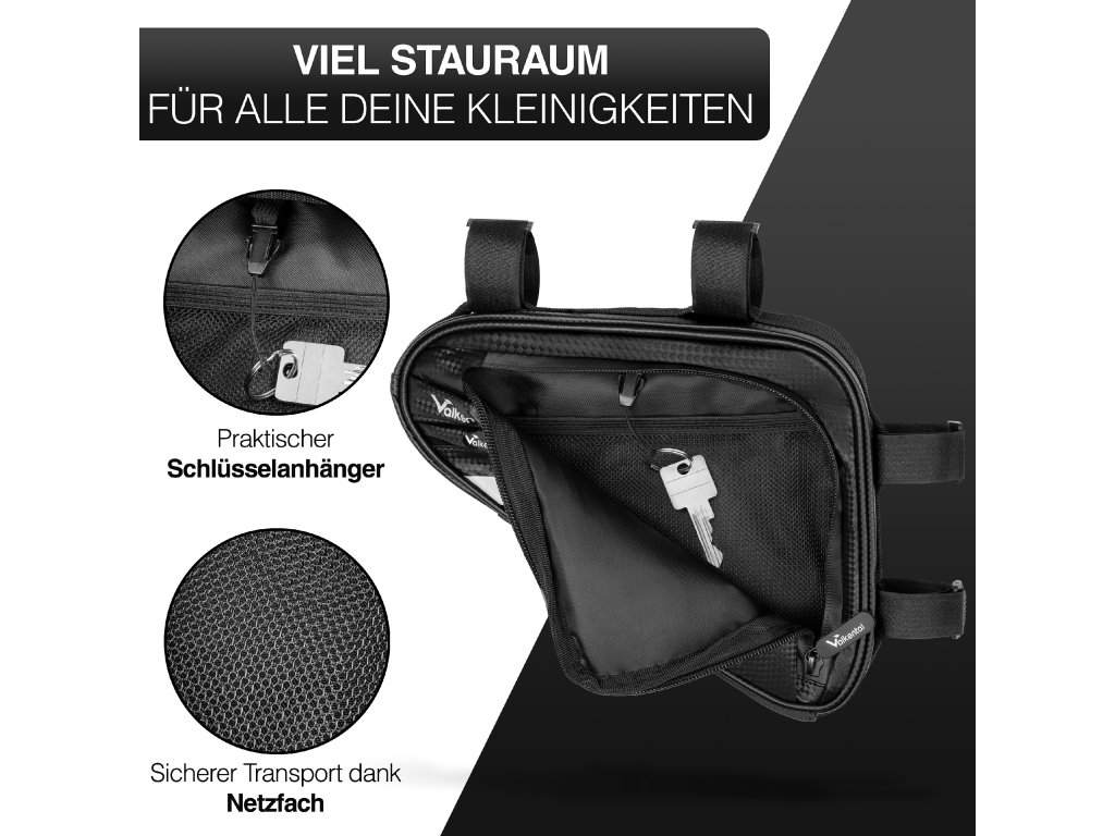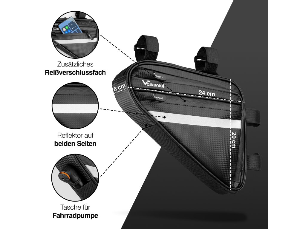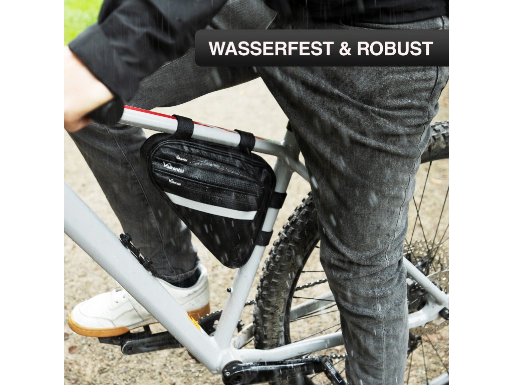 Rámová brašna Valkental Triangle Bag je praktickým doplňkem pro každého cyklistu, který chce mít své věci bezpečně uložené a vždy po ruce. Díky svému trojúhelníkovému tvaru perfektně zapadne do rámu kola a nijak neomezuje jízdu. Brašna nabízí dostatek úložného prostoru pro drobnosti, jako je mobilní telefon, klíče, peněženka, nářadí nebo energetická svačina. Černý minimalistický design působí elegantně a hodí se ke každému typu kola – od městského až po sportovní.