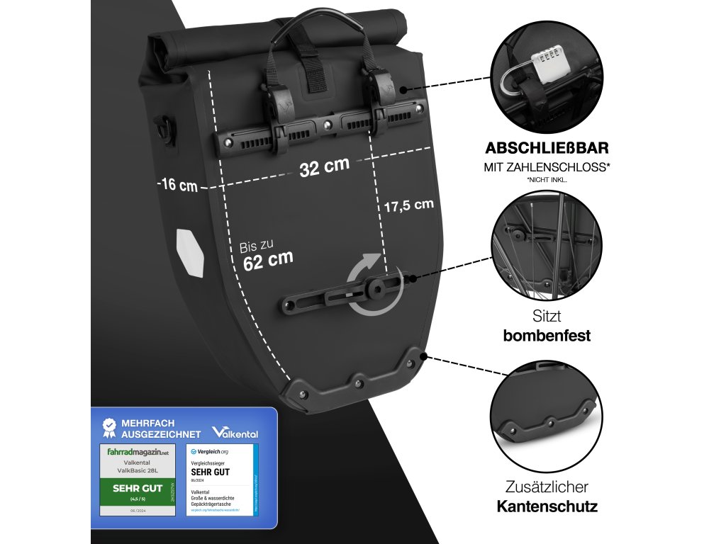 Brašna ValkBasic je praktickým a spolehlivým řešením pro každodenní dojíždění i delší cyklistické výlety. Díky voděodolnému materiálu z odolné plachtoviny spolehlivě ochrání vaše věci před deštěm, vlhkostí i nečistotami. Rolovací uzávěr umožňuje snadno přizpůsobit objem podle aktuální potřeby v rozmezí 22 až 28 litrů a zároveň zajišťuje bezpečné uzavření obsahu. Brašna má rozměry 62 × 32 × 17 cm, takže nabízí dostatek prostoru bez zbytečné zátěže. Upevnění na nosič je řešeno pomocí pevných háků s maximálním průměrem 16 mm, přičemž vzdálenost háků od dna brašny je 37 cm. Součástí balení jsou také redukční vložky pro různé průměry trubek, což zajišťuje širokou kompatibilitu s různými typy nosičů. Praktický ramenní popruh navíc umožňuje pohodlné nošení brašny i mimo kolo.