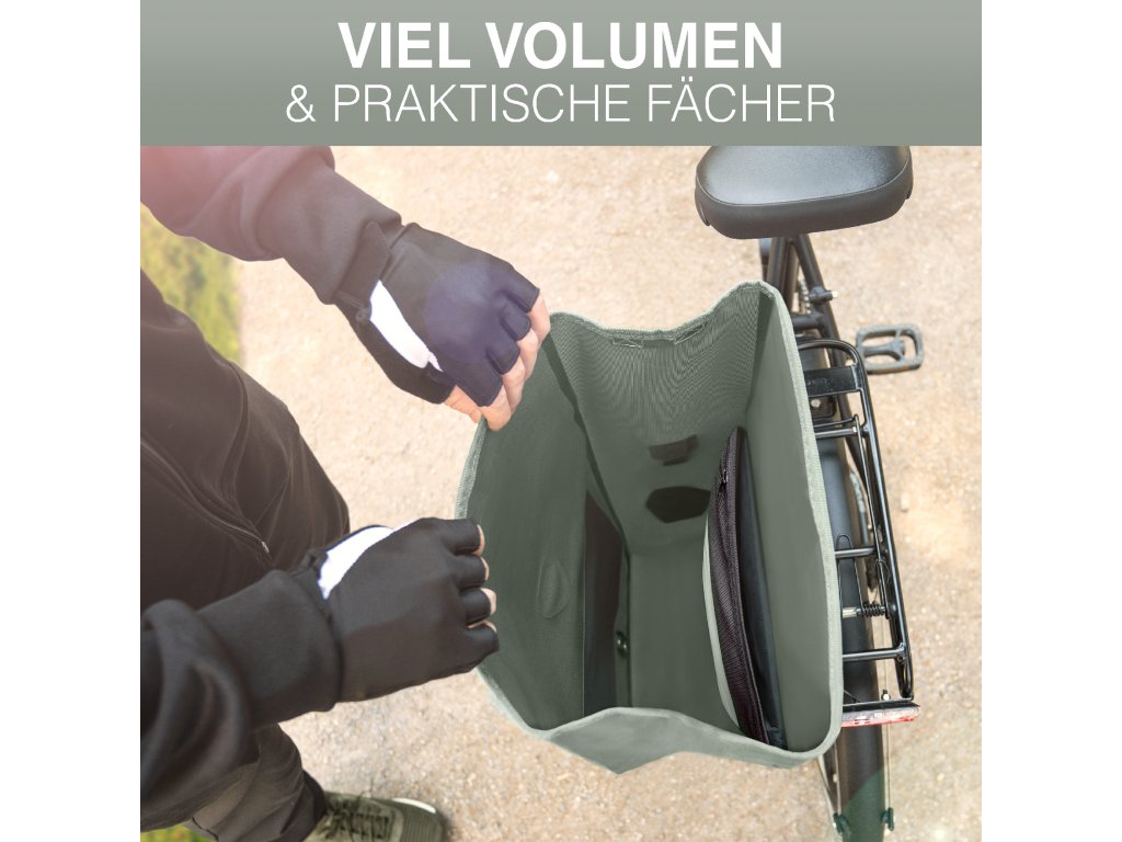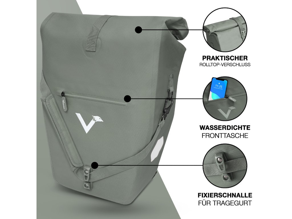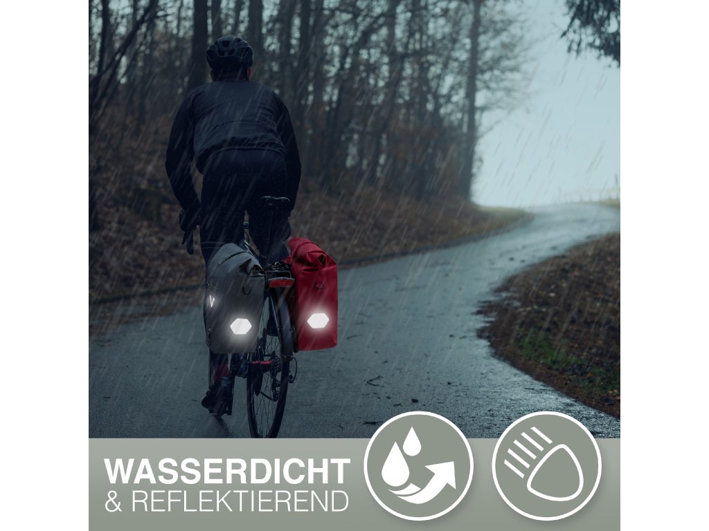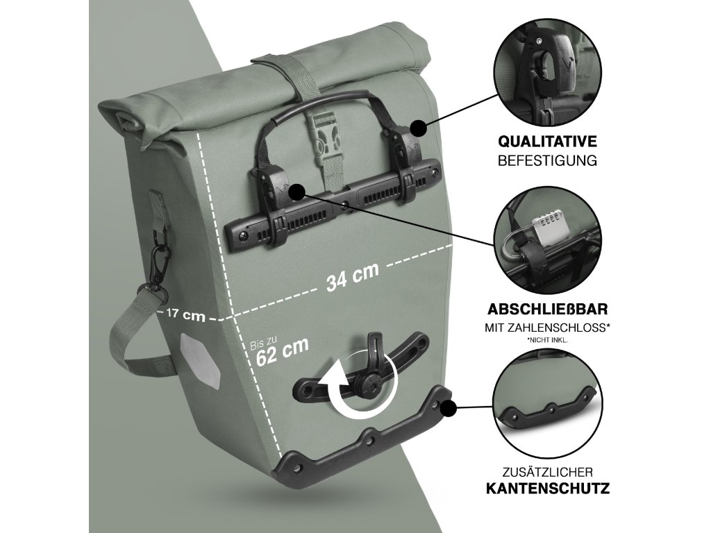 Brašna je vyrobena z ekologického TPU materiálu, který je nejen šetrnější k životnímu prostředí, ale zároveň extrémně odolný a zcela nepromokavý. Díky rolovacímu uzávěru lze objem snadno přizpůsobit aktuálním potřebám v rozmezí 22 až 28 litrů. Bezpečné uchycení na nosič zajišťují pevné háky vhodné pro nosiče s maximálním průměrem tyče 18 mm. Součástí balení jsou také redukční vložky, které umožňují přesné a stabilní přizpůsobení. Velkou výhodou je dostatečná vzdálenost uchycení od země (37 cm), která zabraňuje kontaktu brašny s kolem.