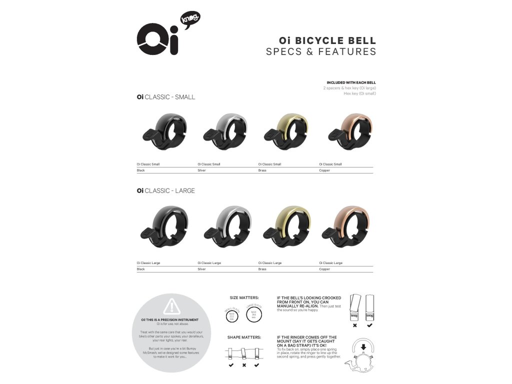 Vyberte si velikost zvonku dle průměru svých řidítek, respektive dle umístění na řidítkách. Malý zvonek Oi se hodí na řídítka o průměru 22,2 mm, např. na horské či trekingové kolo, BMX a klasická městská kola (blízko gripů). Velký zvonek Oi se hodí na řídítka o průměru 23,8 až 31,8 mm, např. silniční kola a některá městská kola (u představce).